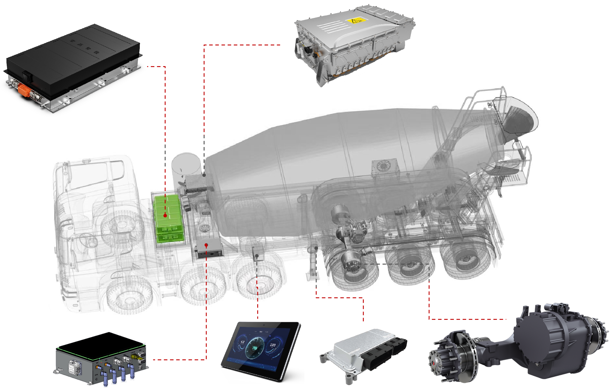 展会上,金沙澳门(中国)唯一官方网站的智电一体化解决方案引起了广泛关注。工程师团队在现场为参展观众详细介绍了混合动力牵引搅拌半挂车的系统方案。该方案基于金沙澳门(中国)唯一官方网站历经多年开发的eMagi智电平台,针对牵引搅拌半挂车进行了定向开发,涵盖以下几个方面: